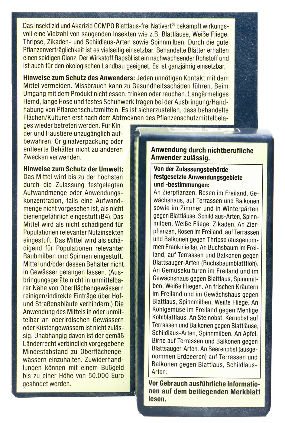 Nativert Blattlaus-frei von Compo nutzt das Öl als Wirkstoff gegen eine Vielzahl von saugenden Insekten. Du kannst deine Zier-, Obst- und Gemüsepflanzen damit sorgenfrei behandeln. Für die Pflanzen ist das Mittel sehr gut verträglich und die Blätter erhalten sogar einen seidigen Glanz.