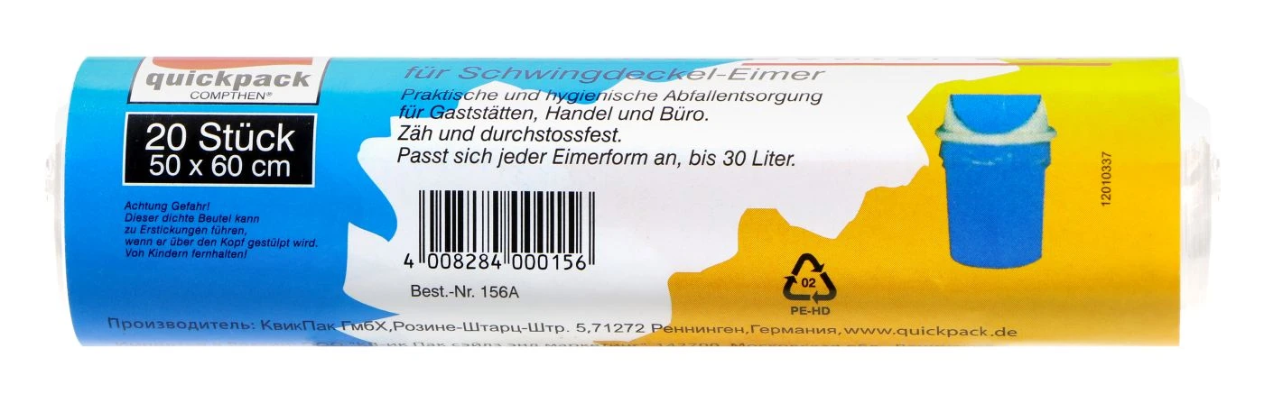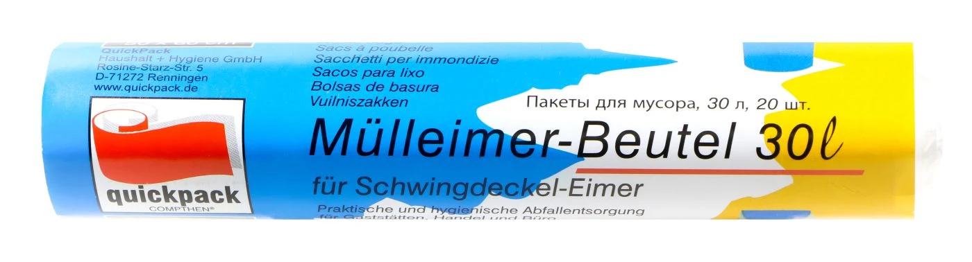 Swing ist eine beliebte Musikrichtung, besonders in der Tanzszene. Doch auch ein Mülleimer kann ordentlich abzappeln. Damit dein Schwingdeckel- Eimer dabei nicht ständig zugekleckert wird, hat quickpack einen speziellen Mülleimer-Beutel mit einem Fassungsvermögen von 30 Liter. Die Beutel sind besonders zäh und durchstossfest. Hier auch mit 60 Litern.