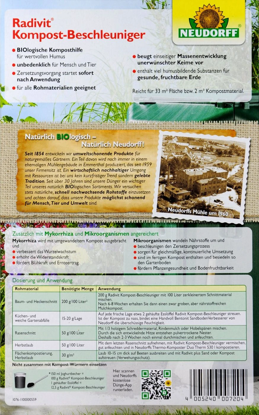 Ein Kompost ist nur etwas für geldudige Menschen. Denkste?! Es geht auch ein bisschen fixer mit dem Radivit Kompost-Beschleuniger von Neudorff. Dieser beinhaltet viel humusbildende Substanzen für eine gesunde und fruchtbare Erde. Und das nur aus naürlichen Rohstoffen, die zum Kreislauf deines Gartens passen. Sobald du mit der Anwendung begonnen hast, startet auch der Beschleuniger mit der Zersetzung.