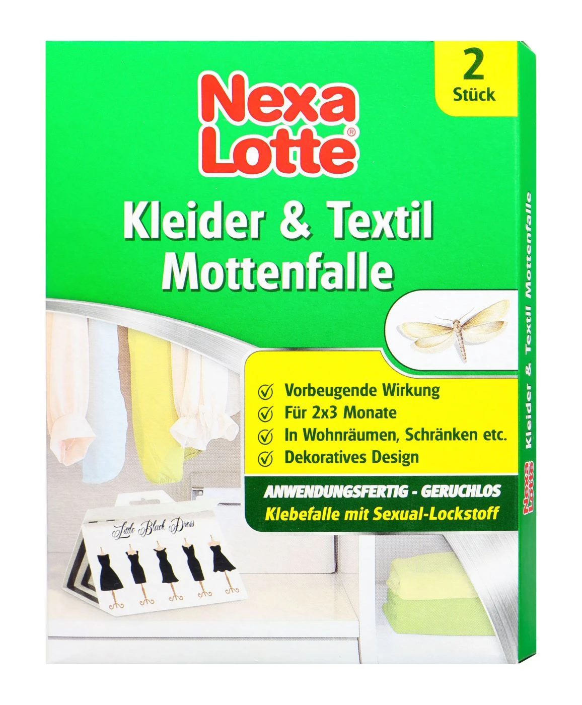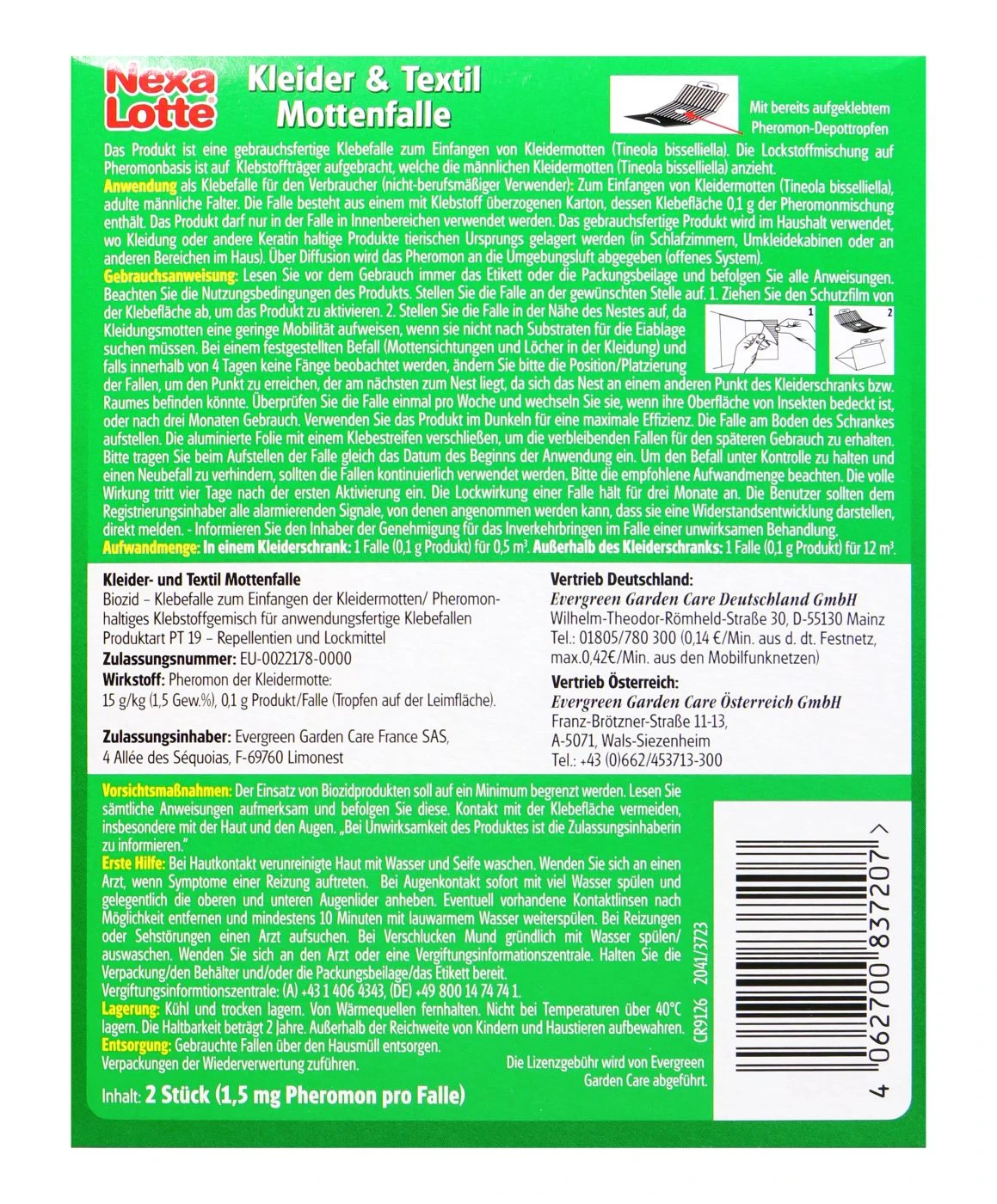 Die Falle enthält einen für uns geruchslosen Pheromon-Depottropfen, von dem die männlichen Motten angezogen werden und auf der Leimfläche kleben bleiben. Du kannst die Falle in jedem Schrank oder Raum platzieren, in dem Kleider oder Textilien vorhanden sind.